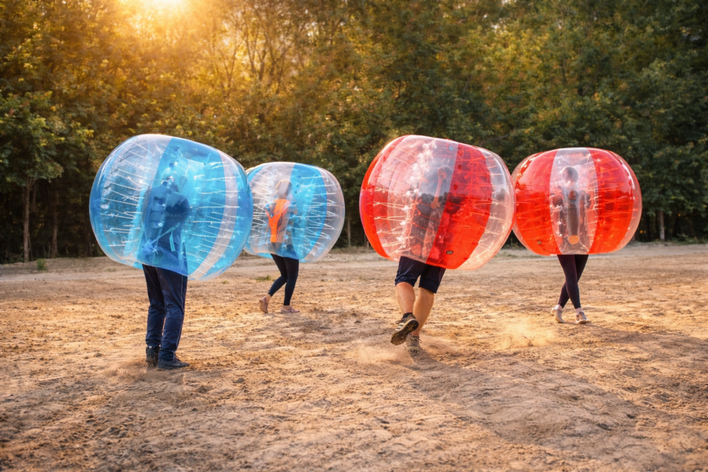 Bubbelvoetbal, dé hilarische variant op voetbal, je beweegt je in een grote, met lucht gevulde bal. Dikke bumperpret terwijl je probeert de bal naar de goal te krijgen van de tegenstander.