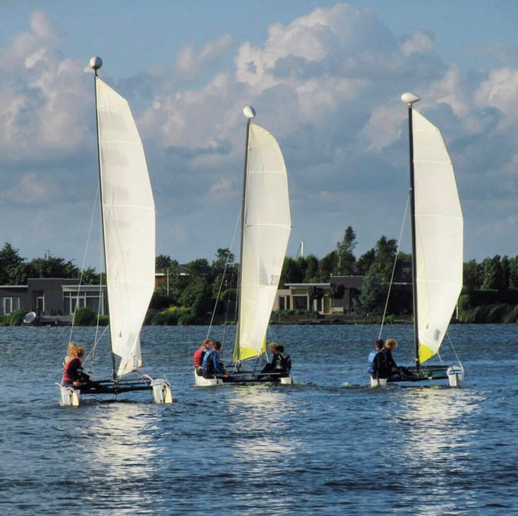 De catamaran is de snelste (wind aangedreven) boot. De instructeur zal de catamaran besturen. Mocht de wind zich ervoor lenen, dan wordt er gebruik gemaakt van trapezes of kan de instructeur de kinderen laten varen. Een zwemdiploma is verplicht!
